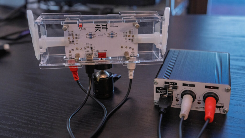 美耳のために専用設計した「美耳 USBオーディオ変換機」は、これ1台を美耳と組み合わせるだけで、スマホやPCで即バイノーラル録音・配信が可能になります。